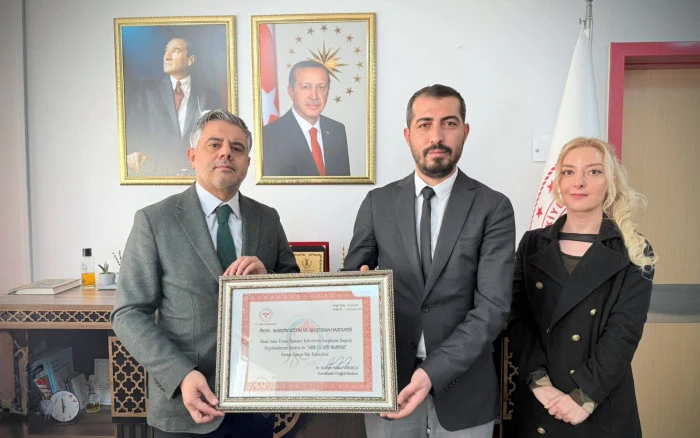 Anne adaylarına güvenli, kaliteli ve destekleyici bir doğum süreci sunmayı hedefleyen uygulamaların değerlendirilmesi neticesinde elde edilen bu başarı, Bakanlık tarafından belgelendirildi. Hastanenin "Anne Dostu Hastane" unvanı, İl Sağlık Müdürümüz Uzm. Dr. Saffet Yavuz, Toplum ve Göç Sağlığı Birim Sorumlusu Zeynep Aydın ile birlikte Hastanemiz Başhekimi Dr. Öğr. Üyesi Ahmet Yeşil’e takdim edildi.