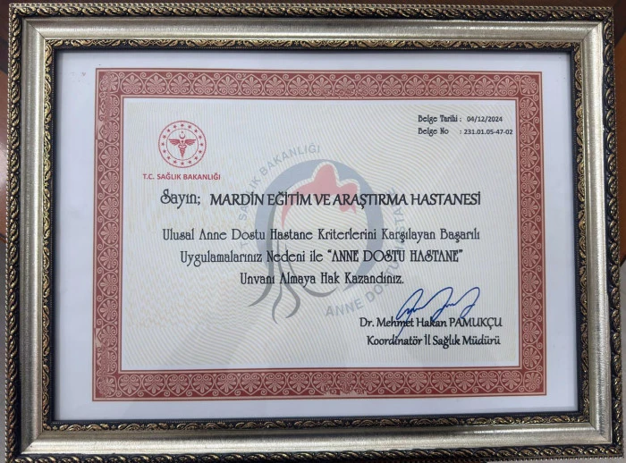 Mardin Eğitim ve Araştırma Hastanesi, anne ve bebek sağlığını önceleyen nitelikli hizmet anlayışı doğrultusunda yürütülen çalışmalar sonucunda "Anne Dostu Hastane" unvanını sürdürmeye hak kazandı.