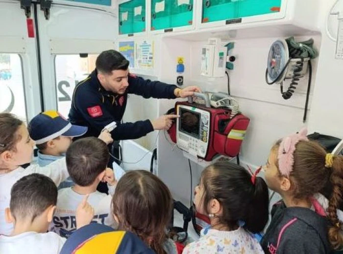 Program kapsamında okul bahçesine getirilen tam donanımlı ambulans, öğrencilerin yoğun ilgisini çekti. Sağlık ekipleri eşliğinde ambulansı gezen miniklere; sedye, oksijen tüpü, kalp monitörü ve diğer tıbbi ekipmanlar tanıtıldı. Uygulamalı anlatımlar sayesinde çocuklar, ambulansın iç işleyişini yakından görme fırsatı buldu. Bu sayede hem merakları giderildi hem de sağlık çalışanlarına duydukları güven artırıldı.