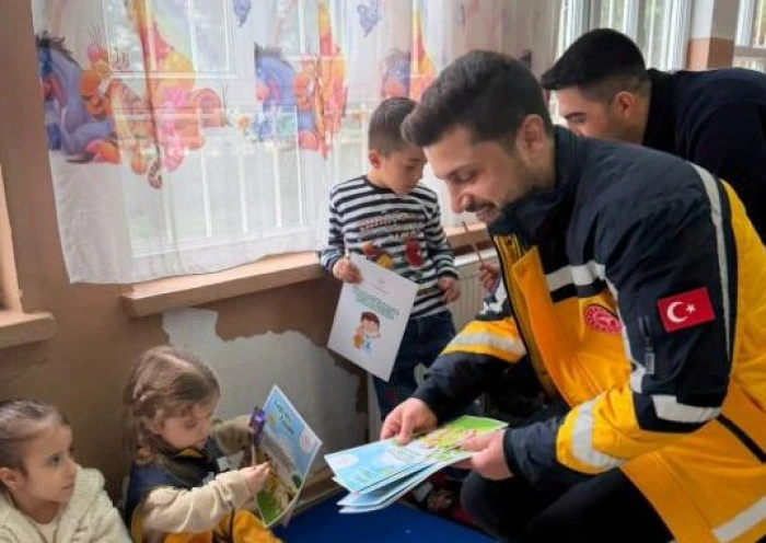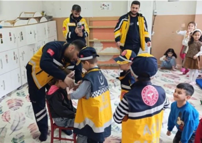 Mardin İl Ambulans Servisi Başhekimi Dr. Yusuf Yeşilmen ve acil sağlık hizmetleri eğitim ekibi tarafından, Midyat 75. Yıl Borsa İstanbul İlkokulu anaokulu öğrencilerine yönelik düzenlenen programda, miniklere acil durumlarda doğru davranış şekilleri uygulamalı olarak anlatıldı.